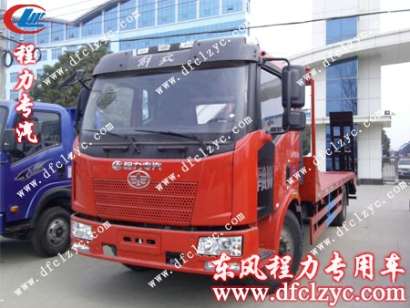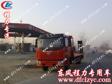 解放平板運(yùn)輸車12月27日上午在湖北程力專用汽車有限公司大門口準(zhǔn)備發(fā)車